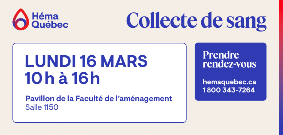 Collecte de sang Héma-Québec à la Faculté de l’aménagement de l’Université de Montréal - 16 mars 2026