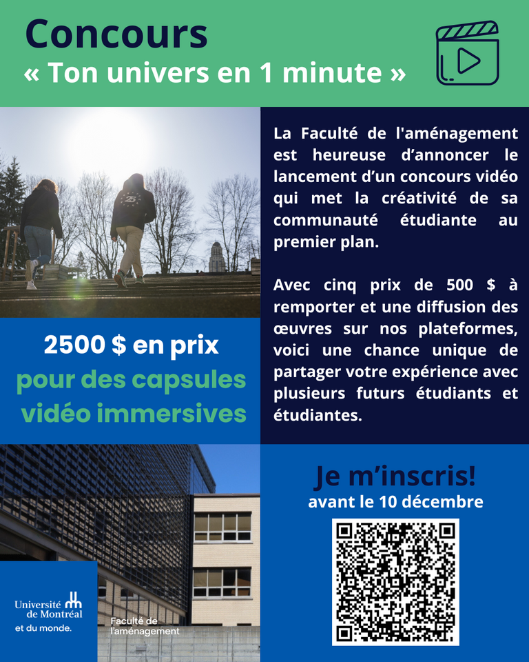 La Faculté de l'aménagement est heureuse d’annoncer le lancement d’un concours vidéo qui met la créativité de sa communauté étudiante au premier plan. Avec cinq prix de 500 $ à remporter et une diffusion des œuvres sur nos plateformes, voici une chance unique de partager votre expérience avec plusieurs futurs étudiants et étudiantes.