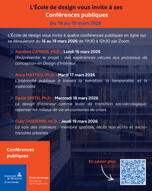L'École de design vous invite à quatre conférences publiques en ligne qui se dérouleront du 16 au 19 mars 2026 de 11h30 à 12h30.