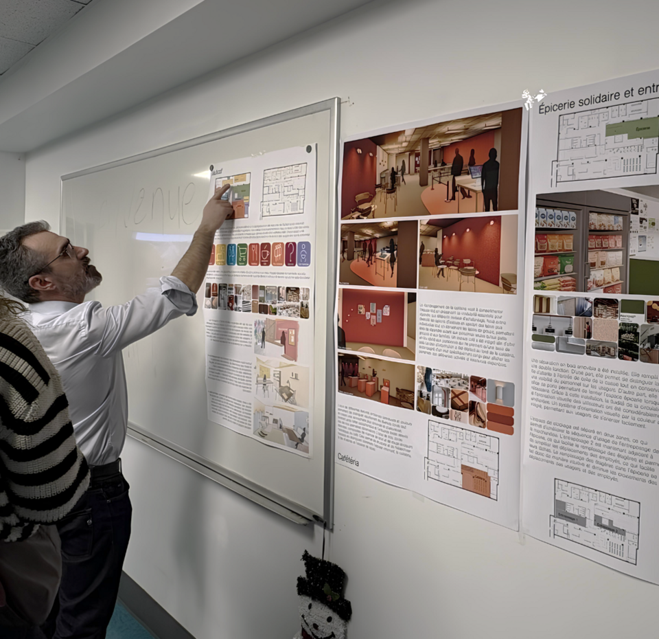 Finalement, au DESS, en deuxième partie de l’atelier-séminaire, le professeur Olivier Vallerand a continué sa collaboration annuelle avec des organismes communautaires en demandant aux étudiant·es d’optimiser l’aménagement des locaux de MultiCaf. Les étudiant·es ont eu à concevoir une activité de conception participative afin de bien comprendre les besoins des employé·es, bénévoles et personnes utilisant les services de cet organisme regroupant cafétéria à faible coût, épicerie solidaire, services de soutien en précarité alimentaire et jardins communautaires. Le défi était d’autant plus grand que les locaux se trouvent dans un sous-sol sans lumière naturelle! En six semaines, les étudiant·es ont bien cerné les enjeux et proposé une série de solutions et stratégies tenant compte des ressources financières limitées de l’organisme et du contexte physique difficile. Plusieurs ont visité à de nombreuses reprises les lieux afin de bien comprendre l’expérience de l’utilisation des services de l’organisme. L’exposition des projets la veille de la fermeture de l’organisme pour la période des fêtes a permis aux étudiant·es de constater encore une fois la pertinence des idées proposées pour cet organisme très fréquenté. Quelques semaines plus tard, la direction est déjà en réflexion sur la mise en place rapide de pistes présentées par différentes équipes.